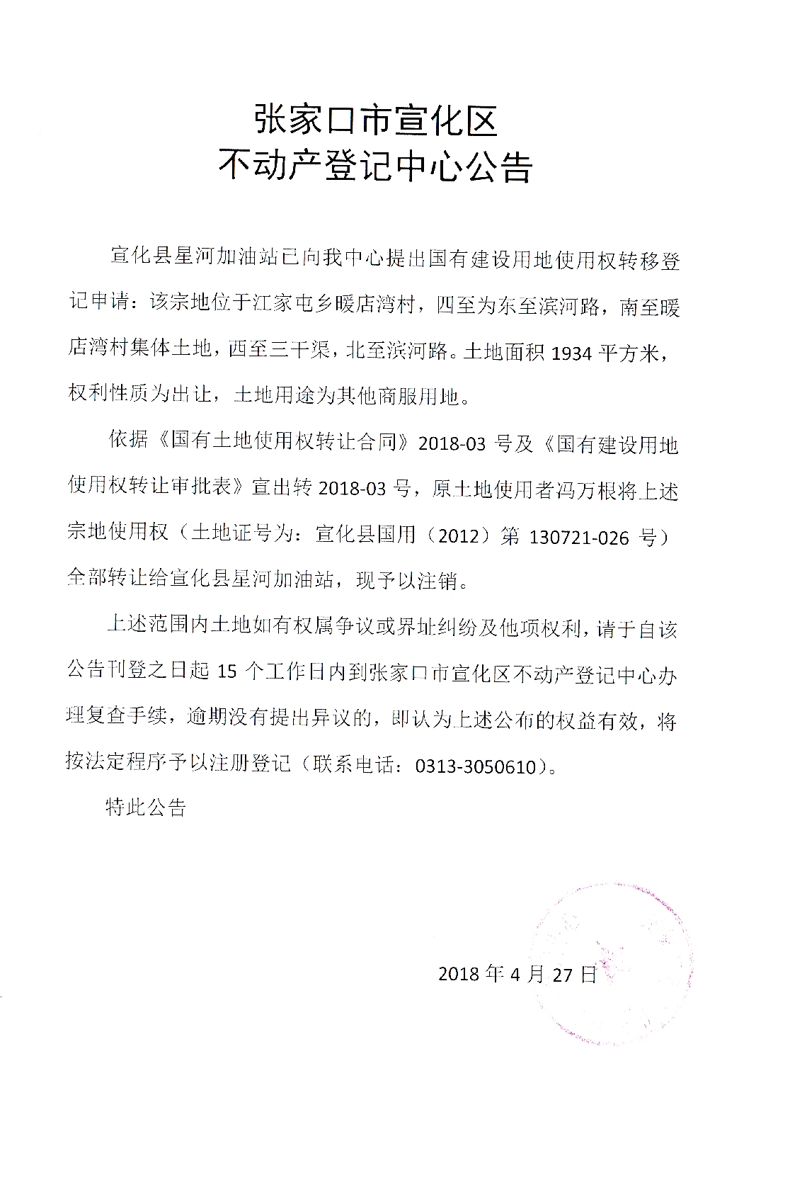 宣化县星河加油站国有建设用地使用权转移登记申请