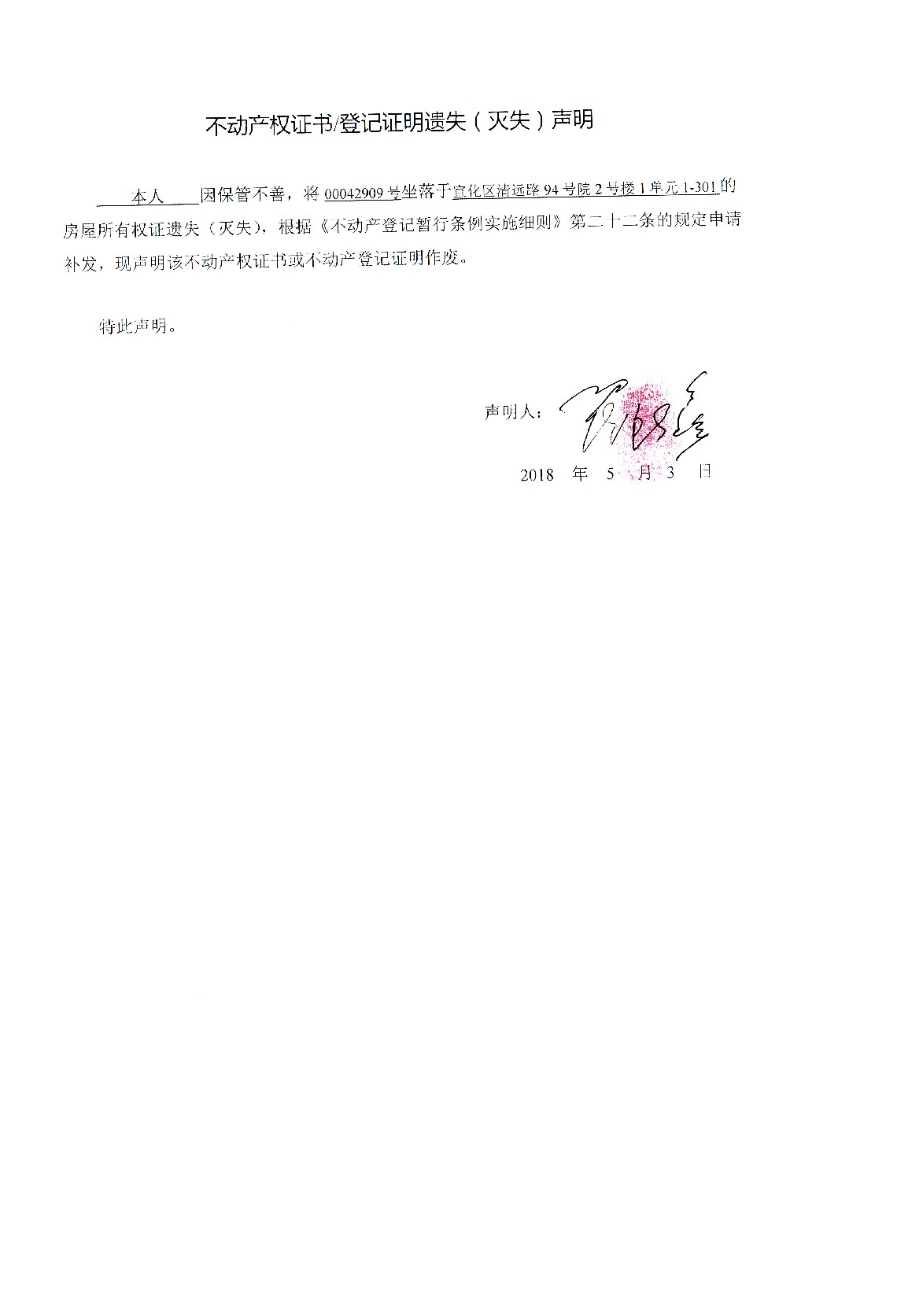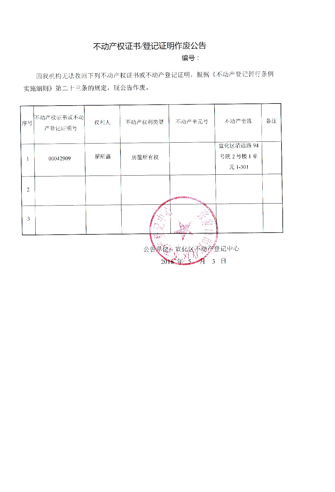 翟所鑫个人不动产登记证书遗失声明作废公告