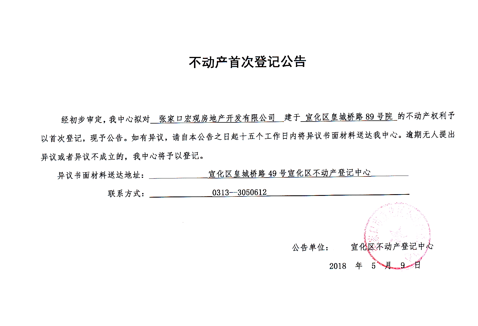 张家口宏观房地产开发有限公司不动产首次登记公告