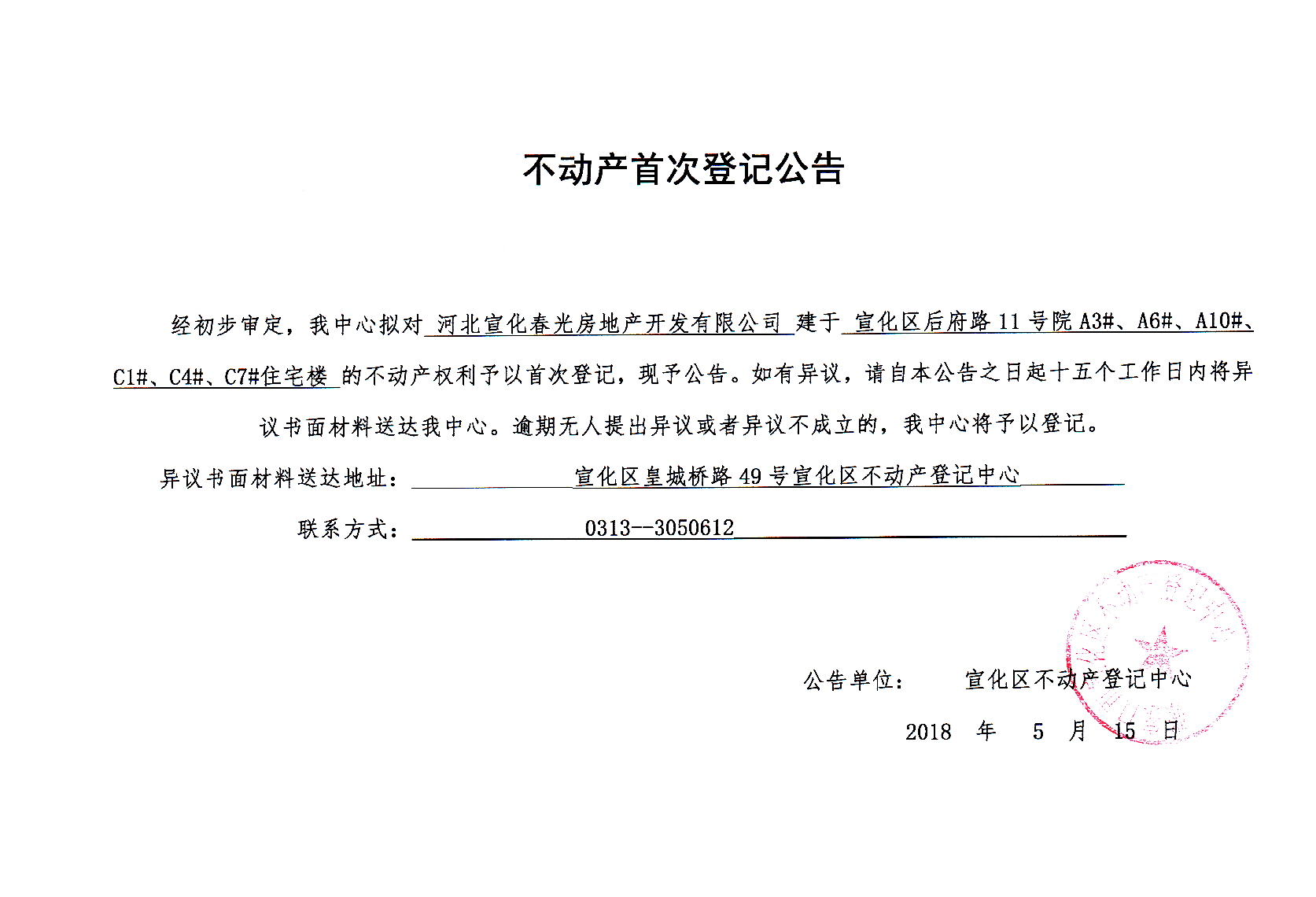 河北宣化春光房地产开发有限公司不动产首次登记公告