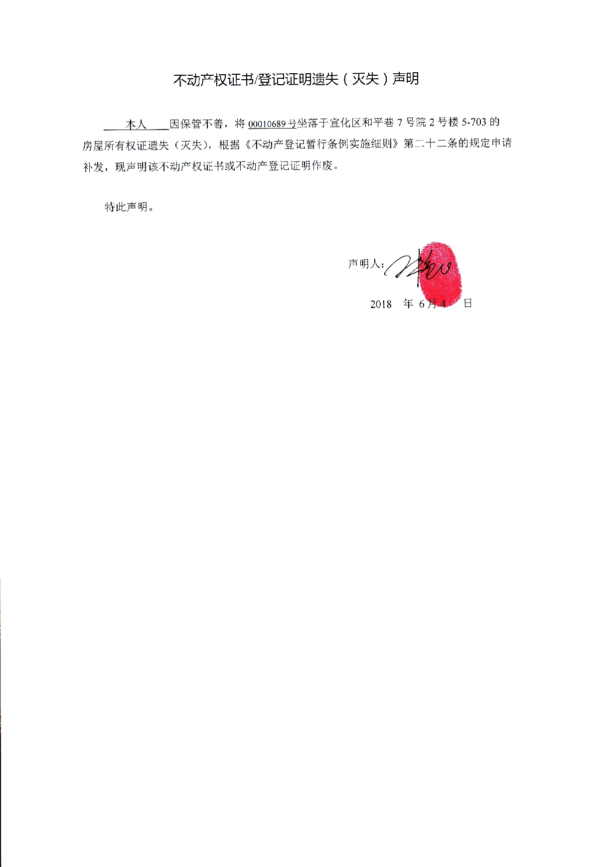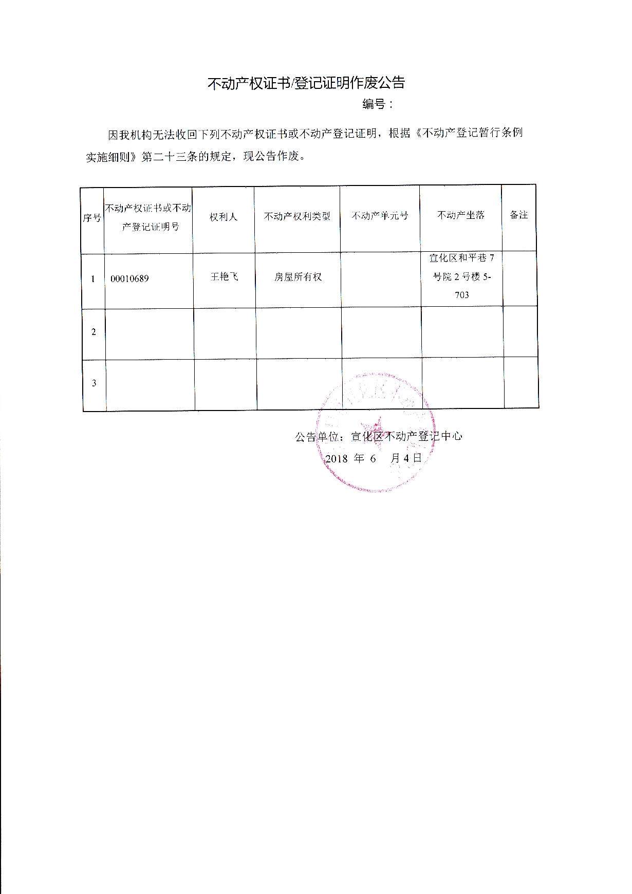 王艳飞个人不动产登记证书遗失声明作废公告