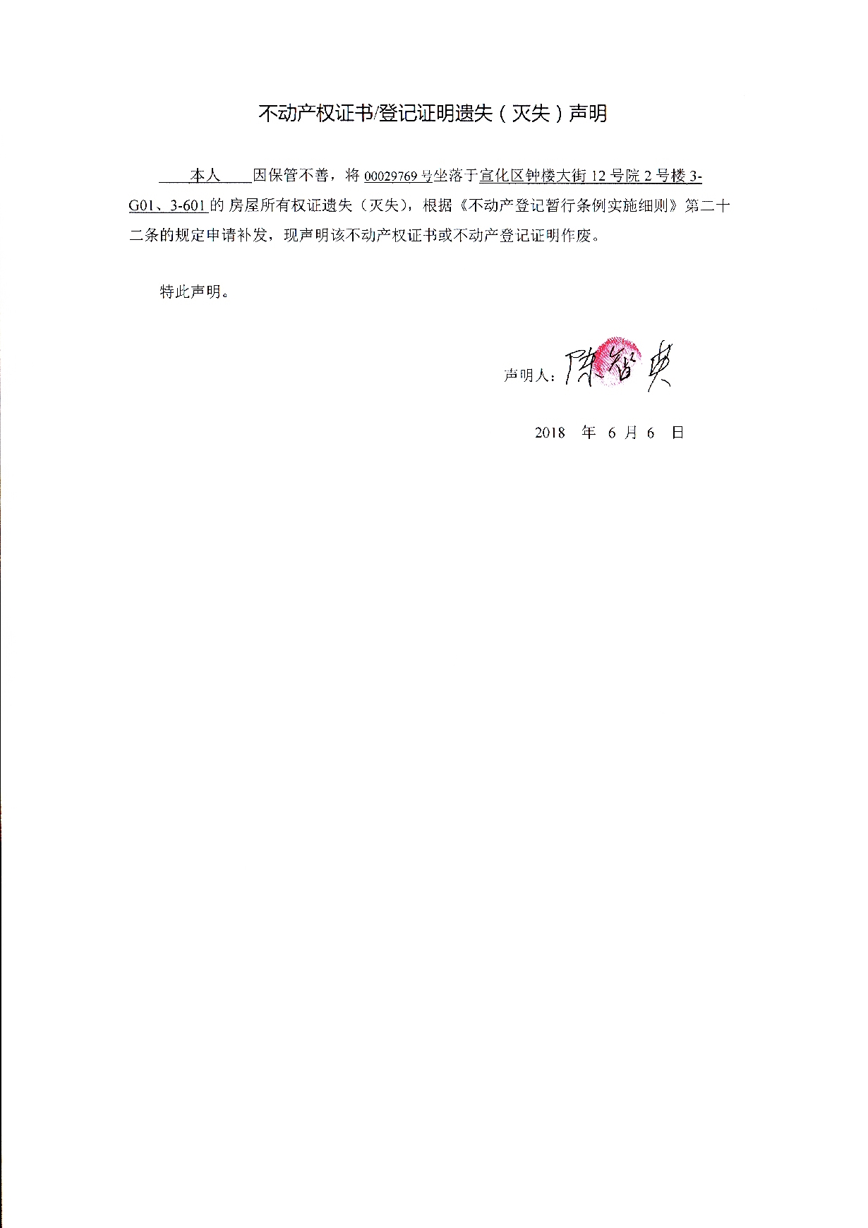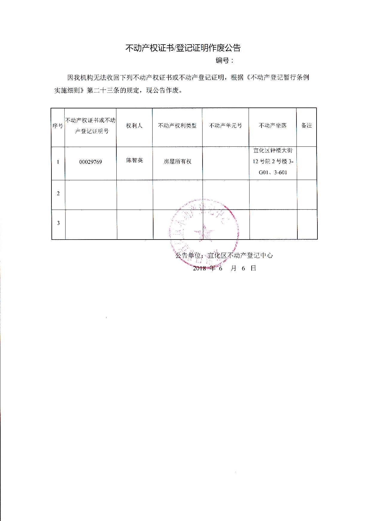 陈智英个人不动产登记证书遗失声明作废公告