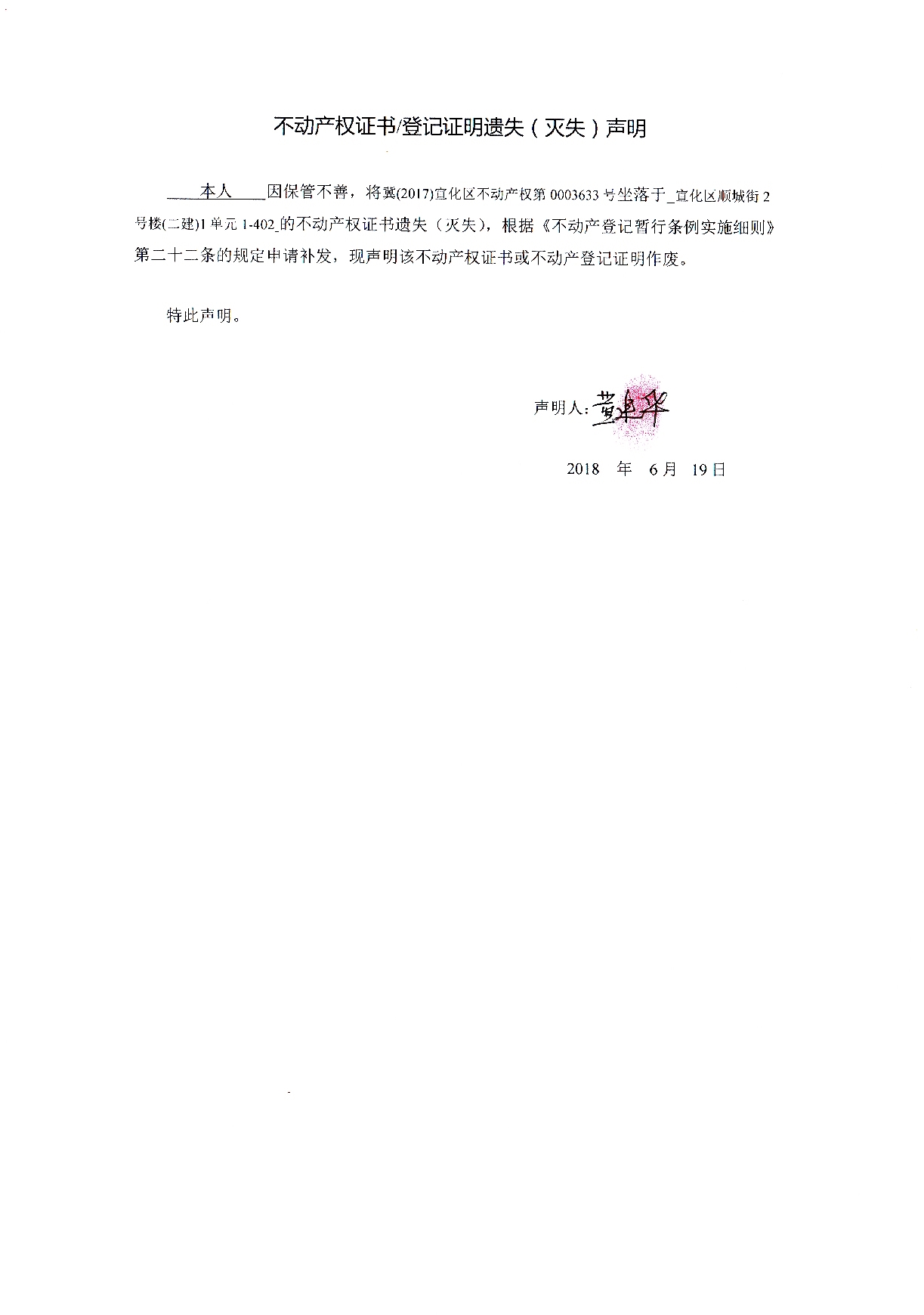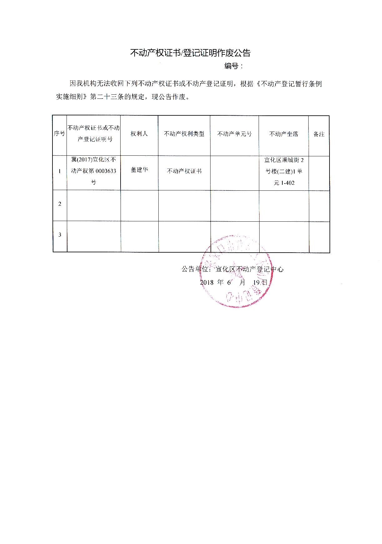 董建华个人不动产登记证书遗失声明作废公告